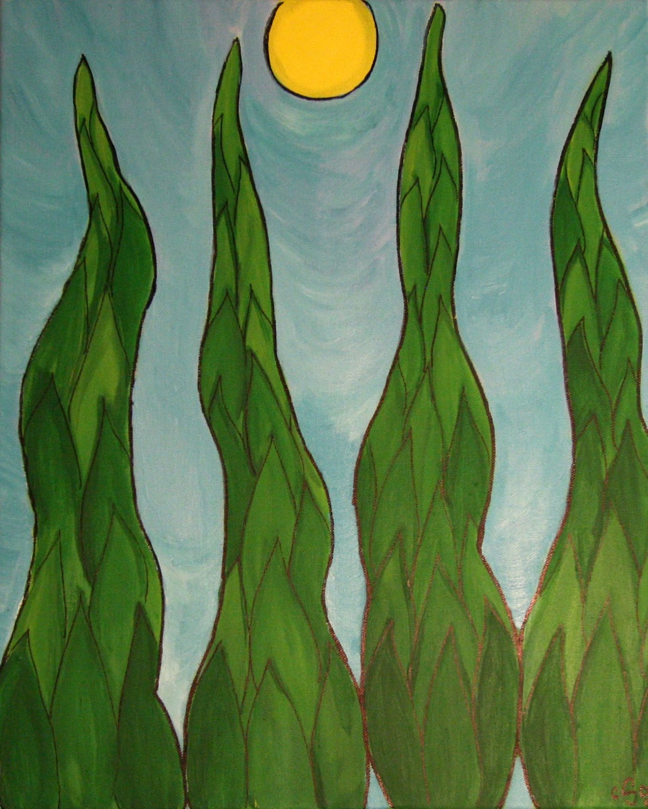 “Roman Pines: Day” of the “Roman Pines: Night and Day” set was inspired by time I spent in Italy with my family. I originally painted 3 sets of “Roman Pines” in a sketch book and then painted the “Roman Pines: Night” for my first art show in the summer of 2008. The painting above (Roman Pines:Day) was painted for a couple as a commission after they saw another version of it at my first art show, which was bought by someone else on opening night. When I told the admiring couple that the painting was originally a triptych, they asked to see the sketch of 3 sets of pines and eventually went with 2 of 3 of the paintings. The end result for “Roman Pines:Day” of what became “Roman Pines: Night and Day” is still one of my favorite paintings of all time. When I delivered the paintings I told them, “You have to hang them with ‘Night’ on the left, like the song”…it’s the only time I’ve told patrons how to hang my paintings. I still don’t know how they have them hung—I hope they followed instructions.