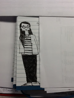 The uppermost drawing is what I was wearing yesterday… my mustard yellow zipper closure J.Crew cardigan with navy and white stripe T from Target Webster collection, black skinny jeans from Nordstroms and gold Tory Burch revas.